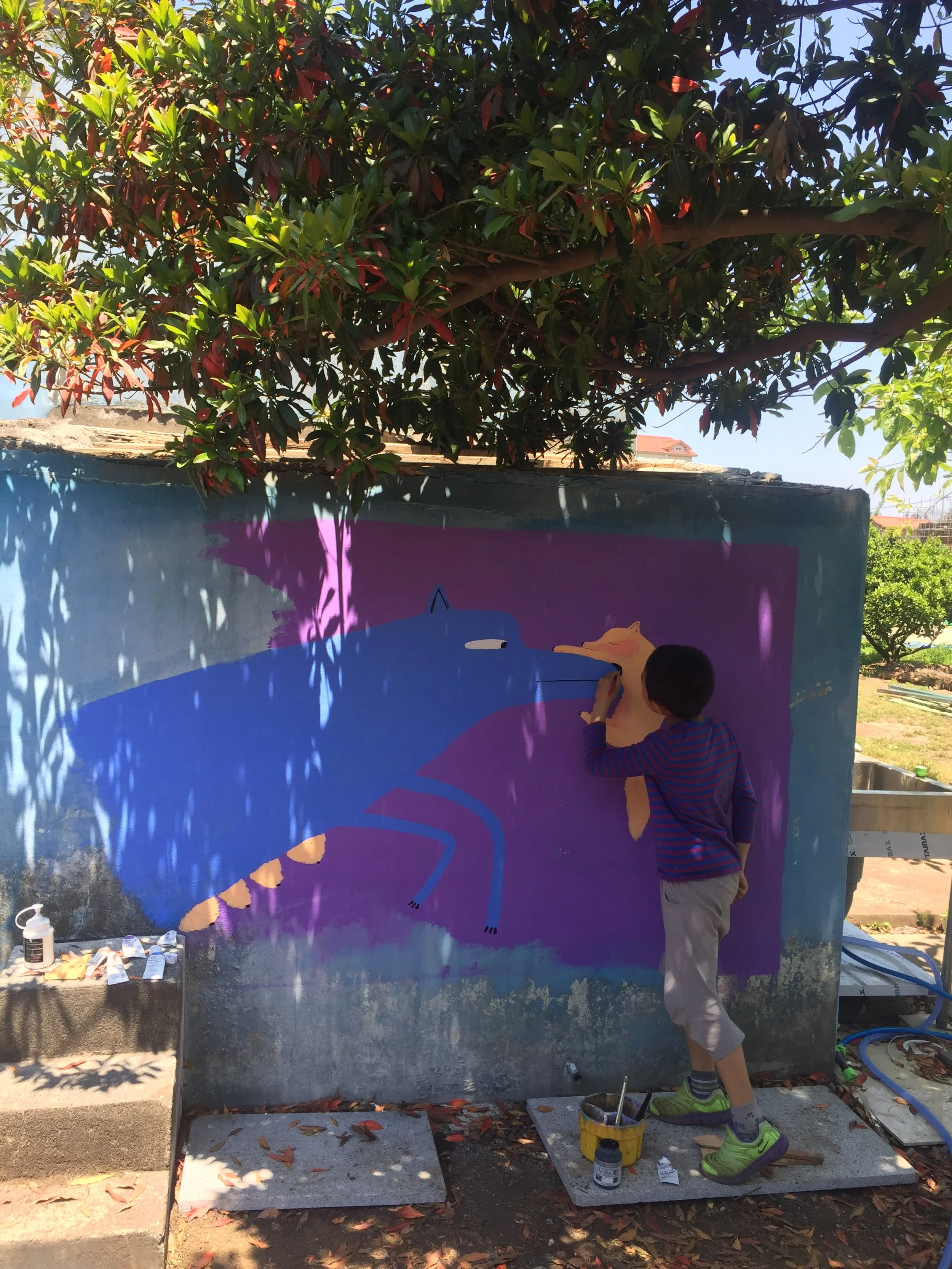 A picture of a mother and son drawn on the wall of the studio